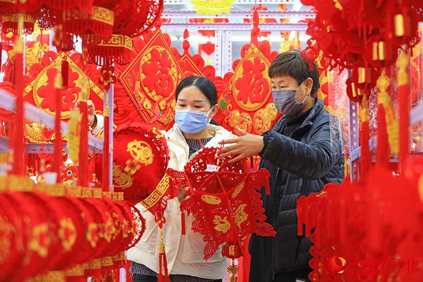 人民網(wǎng)石家莊1月19日電 春節(jié)臨近,河北各地賣場里春聯(lián)、福字、紅燈籠、中國結(jié)、剪紙窗花等多種春節(jié)飾品琳瑯滿目,紅彤彤一大片,令人目不暇接,吸引了不少顧客前往選購,裝扮美好的虎年春節(jié)。(付兆颯、張永新)