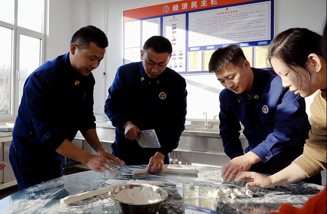 室外寒氣襲人,室內溫暖四溢,其樂融融,消防救援人員及家屬在消防站貼窗花、掛燈籠……參觀中,孩子們稚嫩的聲音回蕩在消防站中,增添了一絲童趣;包水餃環(huán)節(jié),大家分工協(xié)作,你搟皮,我包餡,氣氛和諧,洋溢著“家”的味道,讓這個冬天情意滿滿。吃餃子、話家常,應和著這溫暖的氛圍,大家圍坐在一起感受著濃濃的年味,昔日嚴肅的食堂充斥著歡聲笑語。在場一位消防救援人員的家屬表示:“孩子爸爸平時回家少,工作環(huán)境又比較危險,作為家屬我們能做的就是全力支持他們的工作,今天來隊參觀對他平時的工作也多了一分了解,以后我會更加支持他的!”