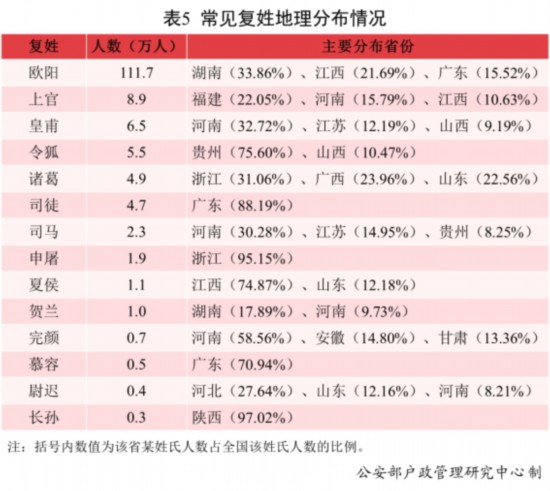復(fù)姓“歐陽(yáng)”33.86%的人口分布在湖南;復(fù)姓“皇甫”32.72%的人口分布在河南;復(fù)姓“諸葛”31.06%的人口分布在浙江;復(fù)姓“司徒”88.19%的人口分布在廣東;復(fù)姓“司馬”30.28%的人口分布在河南;復(fù)姓“夏侯”74.87%的人口分布在江西。