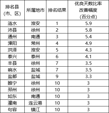 優(yōu)良天數(shù)比率改善幅度相對較好的前10位(1-10名)依次是:漣水、沛縣、通州、溧陽、洪澤、泰興、豐縣(響水并列)、鹽都、睢寧(邳州、如東、灌南、句容并列)。
