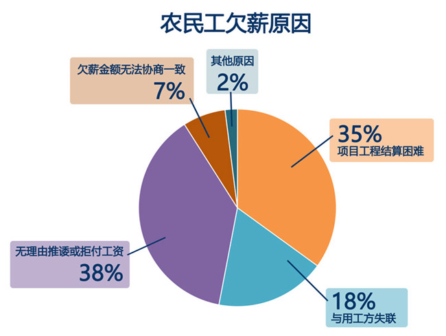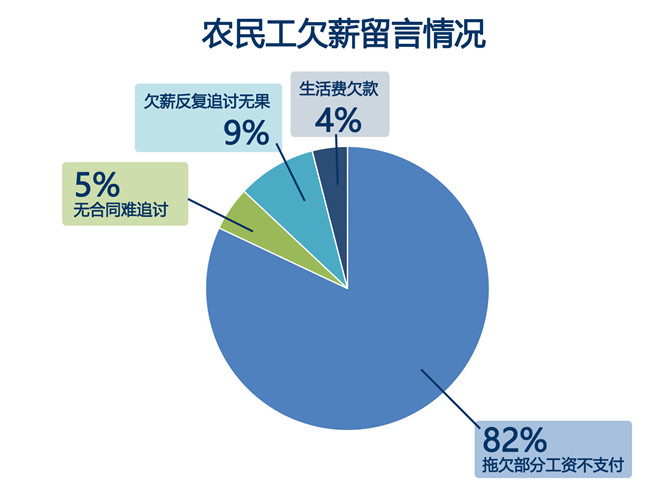 在群眾留言中,農(nóng)民工欠薪的情況大部分為薪資未全額支付,這類占留言總數(shù)的約82%;無勞動(dòng)合同、反復(fù)追討無果以及拖欠生活費(fèi)的情況也有發(fā)生。項(xiàng)目工程結(jié)算困難、用工方推諉則是導(dǎo)致欠薪的主要原因。
