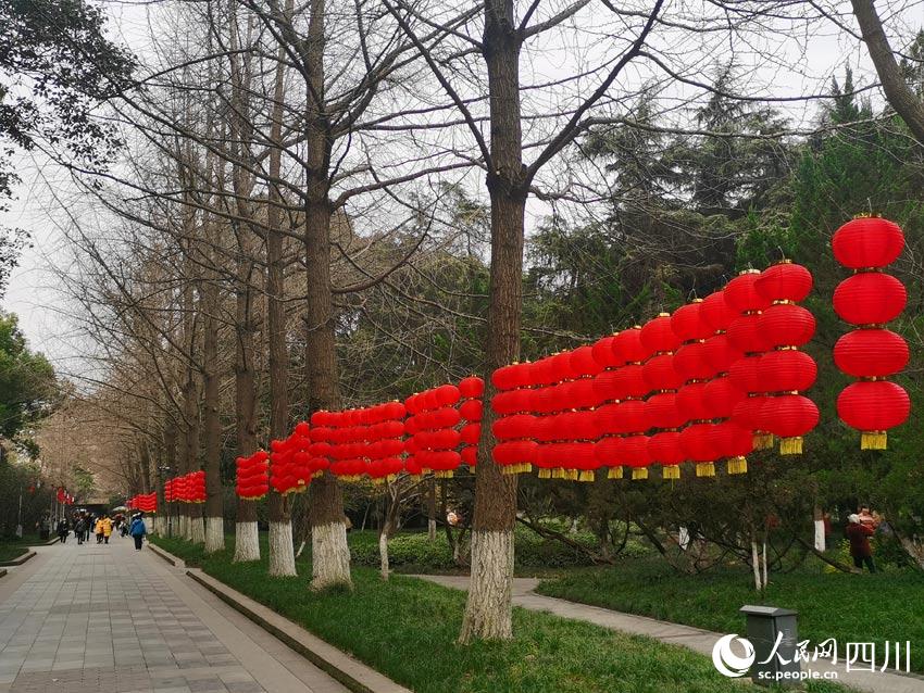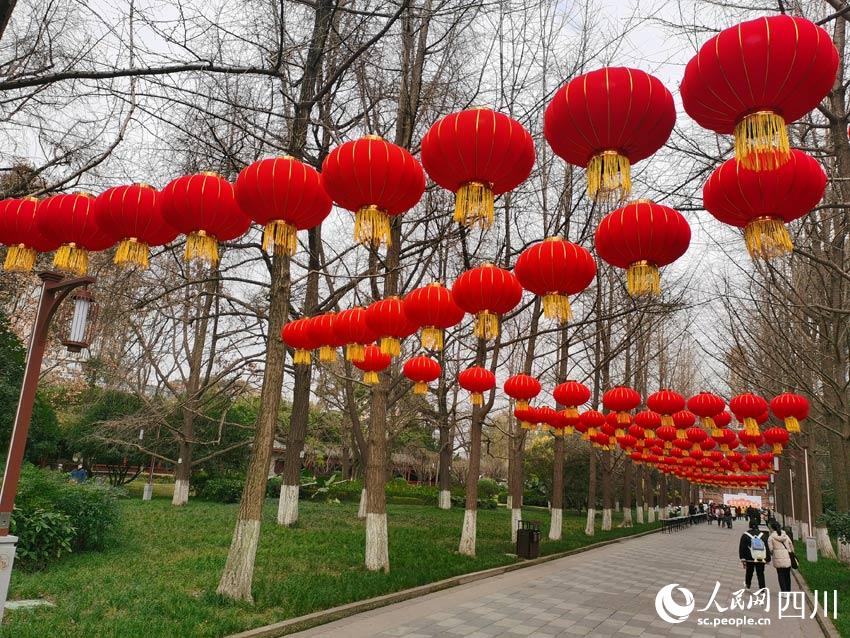 公園的大門布置成了喜慶的大紅色,門上門旁掛滿了紅燈籠。一串四個(gè)紅燈,既可以理解為“四季平安”,也可以理解為“四季發(fā)財(cái)”,還可以理解成“四平八穩(wěn)”……中國文化的詩意內(nèi)涵,可以激發(fā)出人們更多的想象力。