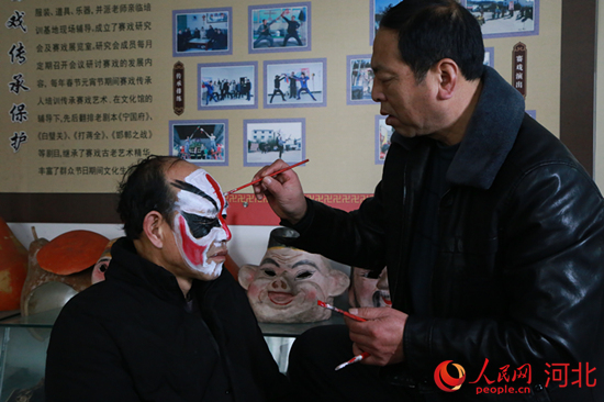 涉縣賽戲代表性傳承人湯香平給演員化妝。 李獻海攝