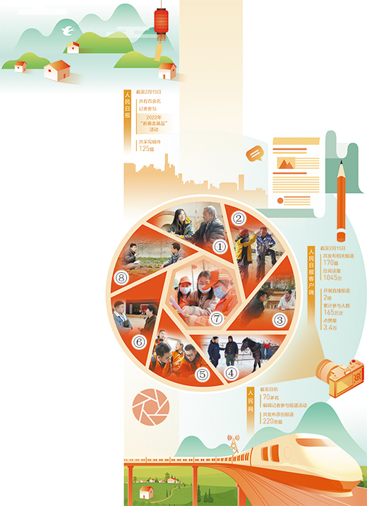 圖①至圖⑧依次為本報重慶分社記者常碧羅(左)、青海分社記者賈豐豐(右)、湖南分社記者王云娜(右)、內(nèi)蒙古分社記者吳勇(左)、福建分社記者劉曉宇(左)、浙江分社記者竇瀚洋(左)、廣西分社記者祝佳祺(中)及人民網(wǎng)記者馮亞濤(左)在春節(jié)期間深入基層采訪。