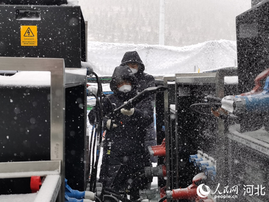 暴雪中,國網冀北電力場館電力保障隊員來到云頂滑雪公園巡視供電設備。 欒志成攝
