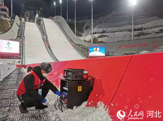 國家跳臺滑雪中心電力保障團隊在賽事后檢查用電設備。 韓寶喜攝