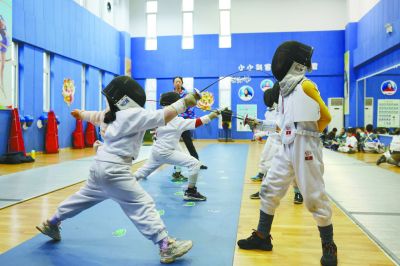 昨天,小學(xué)生在鼓樓區(qū)南財(cái)大附小參加擊劍社團(tuán)活動(dòng)。 南京日?qǐng)?bào)/紫金山新聞?dòng)浾?徐琦 攝
