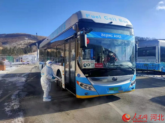 張家口賽區(qū)運行保障團隊工作人員在對車輛進行消毒工作。 譚磊攝