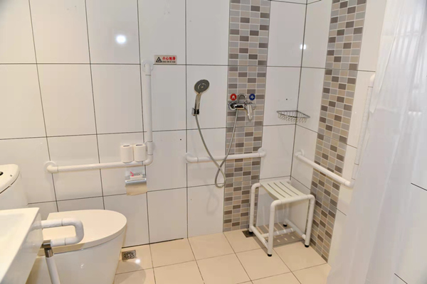 酒店前臺設置了低位服務臺,坐著就可以辦理入住登記等手續(xù)。進入電梯后,電梯按鈕上附有盲文,方便視力障礙人士使用;鏡面、扶手、語音播報一應俱全。來到客房部,走廊平整開闊,鋪設了防滑地膠,客房的房門也進行了拓寬。進入客房內(nèi),低位開關、無障礙寫字桌、開放式衣柜等,讓人感覺溫暖、舒適。衛(wèi)生間里配備了各類無障礙設施,淋浴區(qū)一側(cè)的墻壁上裝有無障礙扶手,并配備了無障礙淋浴椅和寬大的浴室鏡等。低位洗手盆旁邊,是低位置物架,上面放著擦手巾。