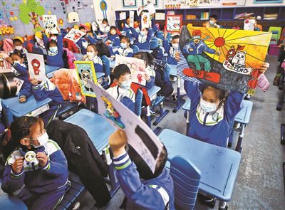 昨天是本市中小學(xué)生春季學(xué)期開(kāi)學(xué)首日,各校的開(kāi)學(xué)第一課紛紛以傳播“冬奧精神”為主打,將冬奧融入“大思政課”。圖為昨天,中科院附屬玉泉小學(xué),同學(xué)們展示自己在寒假里創(chuàng)作的以冬奧、“冰墩墩”為主題的藝術(shù)作品。攝影/本報(bào)記者 郝羿