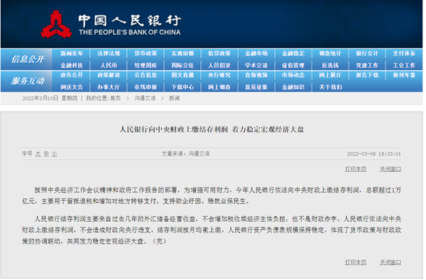 3月8日,財政部有關(guān)負(fù)責(zé)人就人民銀行上繳近年結(jié)存利潤問題答記者問時表示,安排特定國有金融機構(gòu)和專營機構(gòu)上繳利潤,是我國的慣例做法,也是統(tǒng)籌財政資源、跨年度調(diào)節(jié)資金的重要手段,其中包括中國煙草總公司、中投公司等,央行也是上繳單位之一。