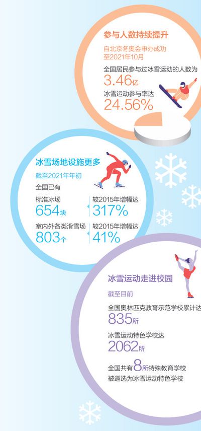 在江蘇,“我為冬奧喝彩”江蘇省全民冰雪運動大動員、冰雪嘉年華、冰壺挑戰(zhàn)賽等活動的舉辦,讓群眾享受冰雪運動帶來的快樂。在四川西嶺雪山滑雪場和成都融創(chuàng)雪世界室內(nèi)滑雪場,大量體育愛好者感受到冰雪運動的魅力。大江南北,長城內(nèi)外,一座座滑雪場規(guī)劃建設,一座座冰雪特色校興辦起來……北京冬奧會和冬殘奧會各個場館也正在積極籌備向公眾開放的計劃。北京冬奧組委規(guī)劃建設部部長劉玉民表示,北京冬奧會最重要的遺產(chǎn)成果是實現(xiàn)了“帶動3億人參與冰雪運動”的目標。
