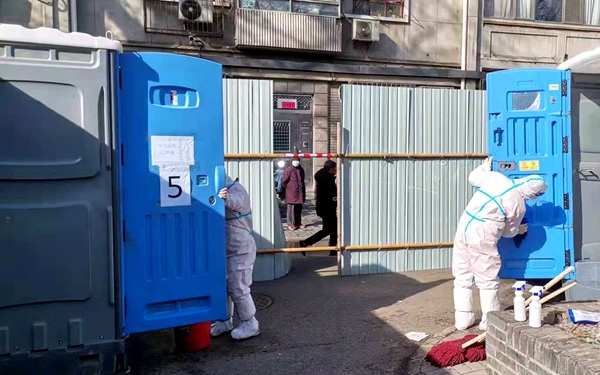剛封閉不久,北新橋街道后永康胡同東口便增加了2座臨時(shí)單坑的移動(dòng)公廁,為后永康胡同1號(hào)院、11號(hào)院隔離居民和防疫人員提供服務(wù);民旺社區(qū)周邊胡同連夜搭建了12座單坑臨時(shí)移動(dòng)公廁,在民旺南胡同為底商設(shè)置2座單坑臨時(shí)移動(dòng)公廁;在北新橋育樹(shù)胡同周邊,11座移動(dòng)公廁也安裝完成。