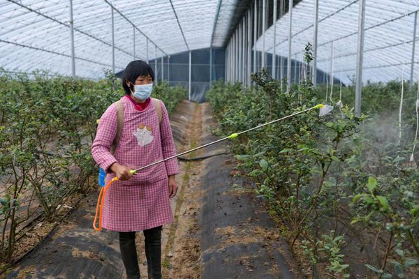 村民在大興鎮(zhèn)藍(lán)莓專業(yè)種植合作社溫室大棚里管護(hù)藍(lán)莓
