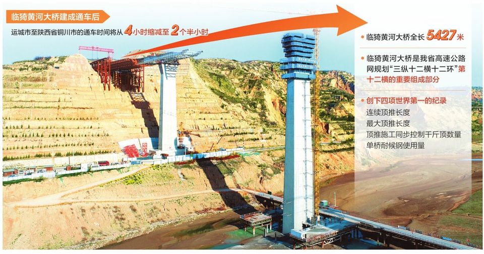 臨猗黃河大橋是連接晉陜最長的黃河公路大橋,全長5427米,主橋采用等高度連續(xù)鋼箱組合梁,從山西、陜西兩處頂推平臺對向頂推,這也創(chuàng)下連續(xù)頂推長度、最大頂推長度、頂推施工同步控制千斤頂數(shù)量以及單橋耐候鋼使用量四項世界第一的紀(jì)錄。