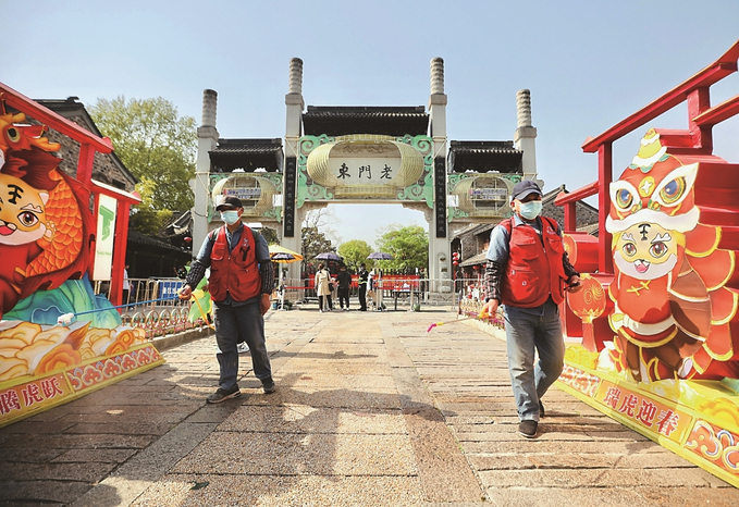 為保障旅游市場有序、游客健康平安,南京老門東景區(qū)嚴抓疫情防控。圖為昨日早晨,景區(qū)工作人員在對公共場所進行消殺,為游客到來做好準備。 本報記者 范俊彥 攝