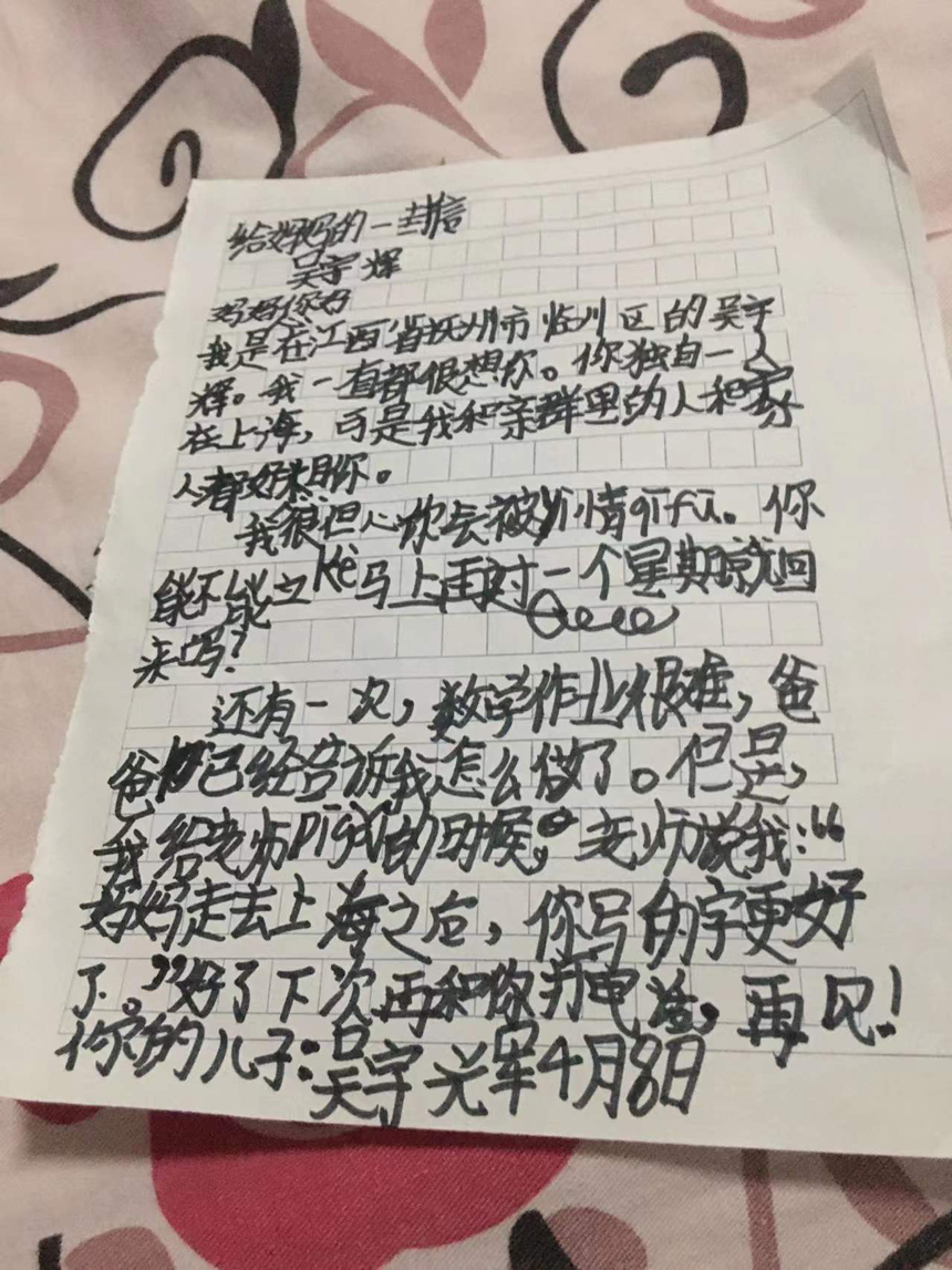 “收到回信后,孩子半天沒吱聲,看著看著眼眶就紅起來了。”吳宇輝的奶奶說,他媽媽不在家的這段時(shí)間,懂事了好多。