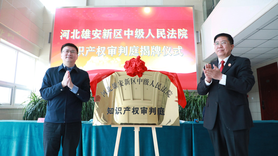 河北雄安新區(qū)中級(jí)人民法院知識(shí)產(chǎn)權(quán)審判庭揭牌儀式現(xiàn)場(chǎng)。 雄安中院供圖