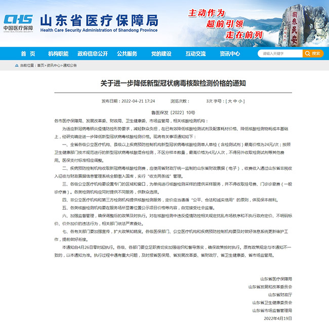 人民網濟南4月22日電(聶俊穹)21日,山東省醫(yī)保局、省發(fā)改委、省財政廳、省衛(wèi)生健康委、省市場監(jiān)管局等五部門聯(lián)合印發(fā)文件,自2022年4月26日零時起,進一步降低新型冠狀病毒核酸檢測價格。