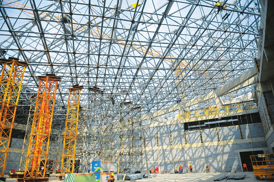 4月24日,瀟河國(guó)際會(huì)議中心建設(shè)現(xiàn)場(chǎng),施工人員在做好疫情防控的基礎(chǔ)上,嚴(yán)守安全生產(chǎn)底線,搶抓施工進(jìn)度。(記者王瑞瑞攝)