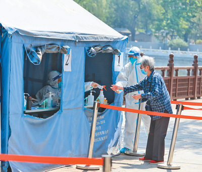 5月4日,北京西城區(qū)什剎海街道荷花市場核酸檢測現(xiàn)場,工作人員引導(dǎo)老人通過綠色通道進行核酸檢測。什剎海街道優(yōu)化點位設(shè)置,減少排隊時間。同時特別關(guān)注老人、兒童等群體,為他們開辟綠色通道,進一步提高采樣工作效率。