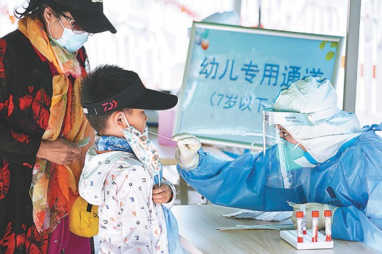 昨天(5月7日),朝陽(yáng)區(qū)啟動(dòng)新一輪大規(guī)模核酸檢測(cè)。為方便居民進(jìn)行核酸采樣,減少交叉幾率,朝陽(yáng)區(qū)小關(guān)街道奧林匹克文化廣場(chǎng)核酸檢測(cè)點(diǎn)設(shè)置“幼兒專(zhuān)用通道”,專(zhuān)為7歲以下兒童提供核酸檢測(cè)服務(wù)。本報(bào)記者 程功攝