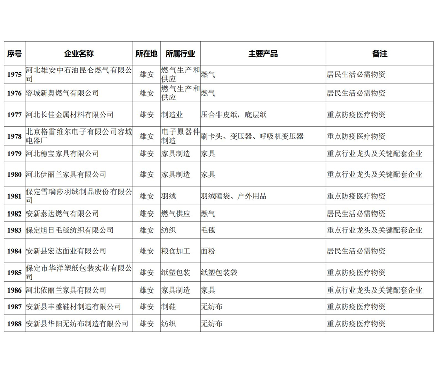日前,河北省工信廳發(fā)布河北省首批重點產(chǎn)業(yè)鏈供應(yīng)鏈企業(yè)“白名單”,圍繞重點防疫醫(yī)療物資、居民生活必需物資、春耕備耕重要物資、戰(zhàn)略性新興產(chǎn)業(yè)關(guān)鍵物資、重點行業(yè)龍頭及關(guān)鍵配套企業(yè)等五個方面,共計1988家,其中重點防疫醫(yī)療物資企業(yè)258家、居民生活必需物資企業(yè)359家、春耕備耕重要物資企業(yè)50家、戰(zhàn)略性新興產(chǎn)業(yè)關(guān)鍵物資企業(yè)426家、重點行業(yè)龍頭及關(guān)鍵配套企業(yè)895家。