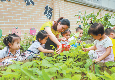江西省贛州市全南縣幼兒園通過開展“合理營養(yǎng)與健康飲食”主題教育活動(dòng),引導(dǎo)孩子們均衡營養(yǎng)、珍惜糧食。圖為老師在幼兒園快樂農(nóng)場教小朋友們采摘蔬菜。