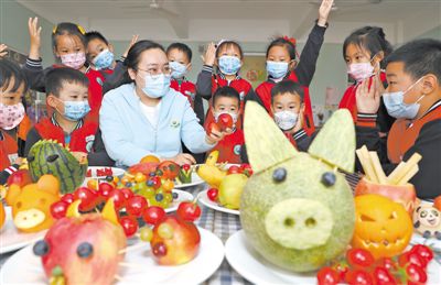 5月20日是“中國學(xué)生營養(yǎng)日”。近日,山東省東營市東營區(qū)一家幼兒園里,師生把五顏六色的水果、蔬菜制作成各種造型,并在制作過程中了解各種水果、蔬菜的營養(yǎng)價(jià)值,引導(dǎo)孩子們不挑食、不偏食,拒絕浪費(fèi),樹立健康飲食觀念。