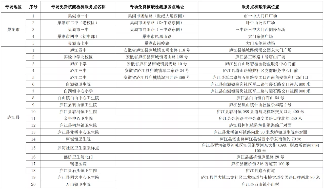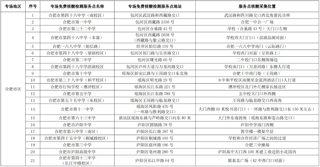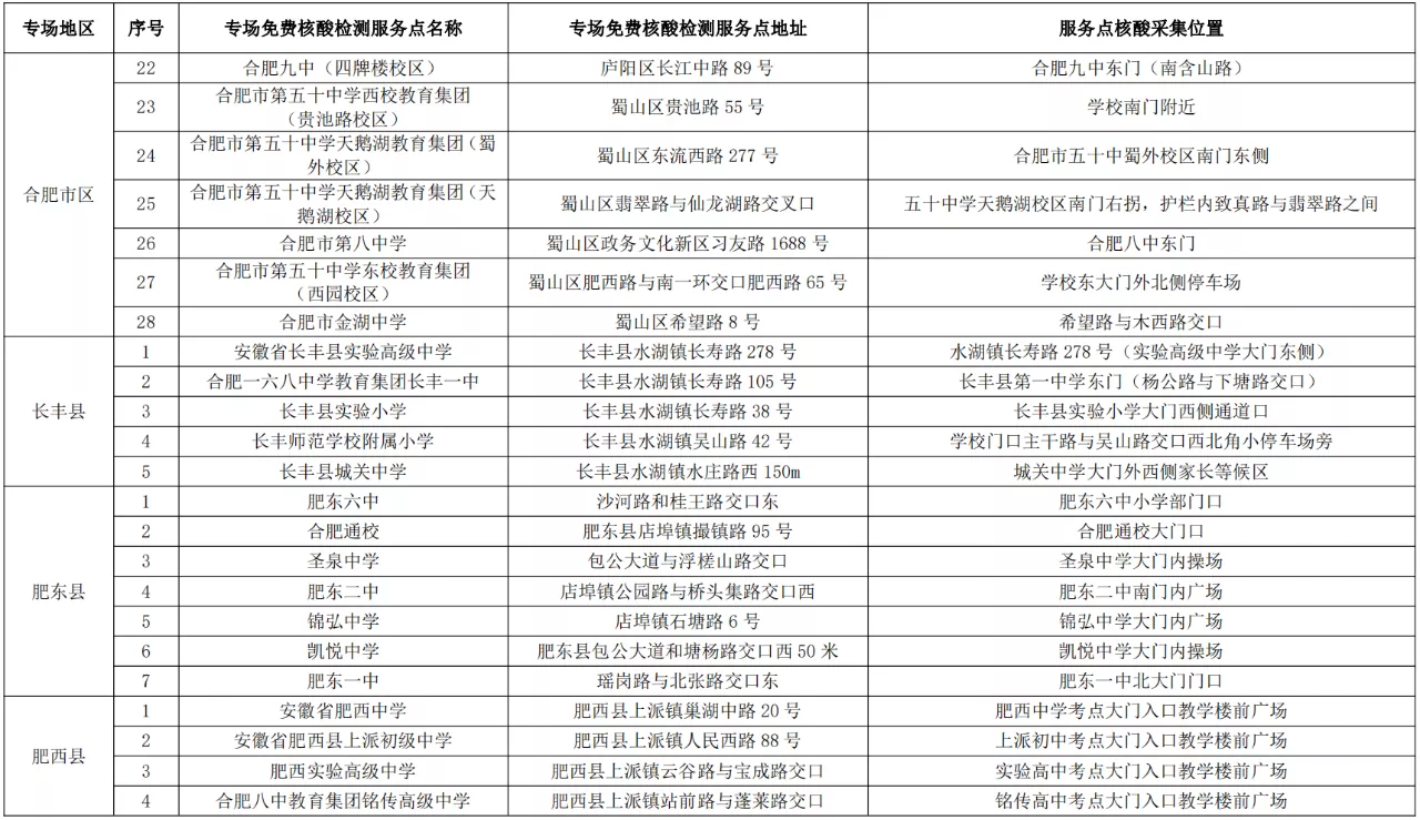 根據要求,各專場免費核酸檢測服務點僅對合肥市高考考生提供服務,考生可持準考證、安康碼就近到專場免費核酸檢測服務點進行核酸采樣,具體檢測點主要設在高考考點周邊。