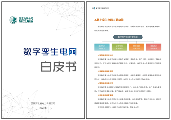 2021年7月,國(guó)網(wǎng)河北電科院聯(lián)合多家單位編制完成并發(fā)布了國(guó)內(nèi)電網(wǎng)領(lǐng)域首個(gè)《數(shù)字孿生電網(wǎng)白皮書(shū)》。白皮書(shū)歸納總結(jié)了雄安數(shù)字孿生建設(shè)成果,系統(tǒng)闡述了數(shù)字孿生電網(wǎng)的主要功能、體系架構(gòu)以及維護(hù)管理方式等內(nèi)容,創(chuàng)造性地提出了數(shù)字孿生電網(wǎng)的技術(shù)架構(gòu)和技術(shù)實(shí)現(xiàn)方式,對(duì)今后數(shù)字孿生技術(shù)在電網(wǎng)領(lǐng)域的探索應(yīng)用具有較強(qiáng)的指導(dǎo)意義。