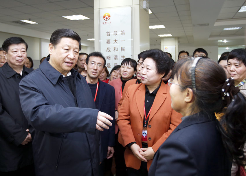 2013年11月27日下午,中共中央總書記、國家主席、中央軍委主席習近平在濟南市外來務工人員綜合服務中心同從事家政服務的“陽光大姐”交流。新華社記者鞠鵬攝