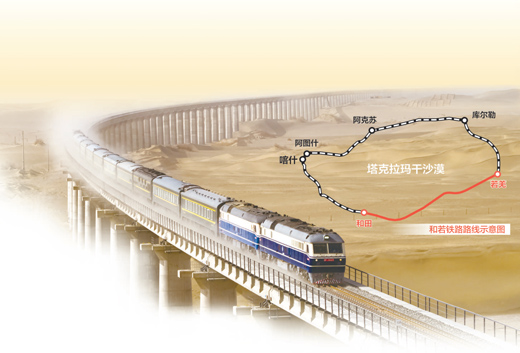 作為國家重點鐵路建設(shè)項目,和若鐵路西起新疆和田地區(qū)和田市,東至巴音郭楞蒙古自治州若羌縣,全長825公里,設(shè)計時速120公里。和若鐵路開通后,與南疆鐵路、格庫鐵路相連,全長2712公里,形成世界首個沙漠鐵路環(huán)線。