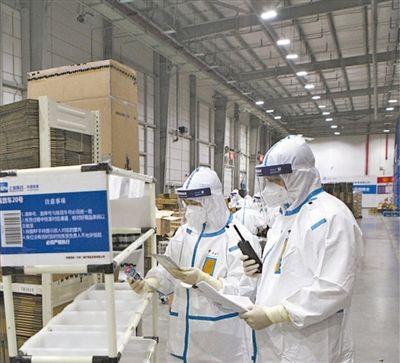 因?yàn)檫M(jìn)口藥品的物流是冷鏈物流,按照嚴(yán)格的衛(wèi)生要求,我們換上白色防護(hù)服,戴上防護(hù)面屏、一次性手套、N95口罩,經(jīng)過掃碼、測(cè)溫,一起進(jìn)入了保稅倉(cāng)。