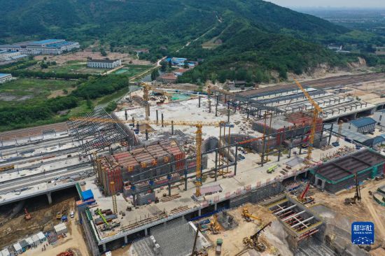 6月26日拍攝的南沿江鐵路江陰站站房主體結(jié)構(gòu)封頂施工現(xiàn)場(無人機照片)。
