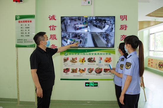 邢臺市市場監(jiān)管部門執(zhí)法人員到邢臺市第二幼兒園檢查“明廚亮灶”情況。 陳克家攝