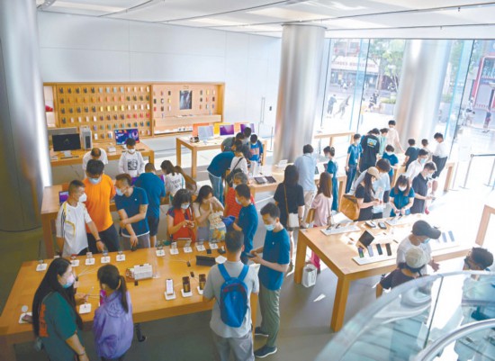 昨天,王府井APM購物中心蘋果產(chǎn)品零售店內(nèi),顧客在手機展示臺前駐足瀏覽,商場內(nèi)客流逐漸恢復(fù)。本報記者 和冠欣攝