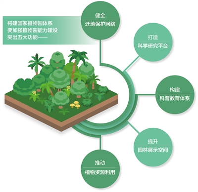 “構(gòu)建國家植物園體系,要加強(qiáng)植物園能力建設(shè),突出五大功能?!敝苤救A介紹,一是健全遷地保護(hù)網(wǎng)絡(luò),建立野生植物遷地保護(hù)栽培繁育體系、遷地保護(hù)信息平臺和綜合保藏體系,提升遷地保護(hù)綜合保藏能力,這是核心功能;二是打造科學(xué)研究平臺,開展遷地保護(hù)基礎(chǔ)科學(xué)研究活動,加強(qiáng)植物保護(hù)國際國內(nèi)交流合作,持續(xù)推進(jìn)植物保護(hù)專業(yè)人才培養(yǎng);三是構(gòu)建科普教育體系,建設(shè)科普教育平臺,實施科普教育培訓(xùn)計劃;四是提升園林展示空間,創(chuàng)新園林園藝展示方式,促進(jìn)公眾深入了解和支持國家植物園建設(shè);五是推動植物資源利用,加大引種馴化和新品種開發(fā)力度,提升城市生態(tài)建設(shè)和產(chǎn)業(yè)服務(wù)水平。