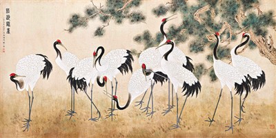 《松齡鶴壽圖》是陳之佛工筆花鳥中尺幅較大的一幅,是為慶祝中華人民共和國成立十周年的獻(xiàn)禮作。10只體態(tài)優(yōu)雅的丹頂鶴,安逸地徜徉于大地之上,或昂首唳天,或回首顧盼,或凝神遠(yuǎn)眺,蒼翠的古松由畫面右上方伸入,枝干蒼勁古樸,松枝郁郁蔥蔥,蘊含著無限生機。陳之佛在中國畫傳統(tǒng)線描基礎(chǔ)上,將西洋畫和裝飾畫的線條加以改造后融入其中,使線條的表現(xiàn)力更為豐富。