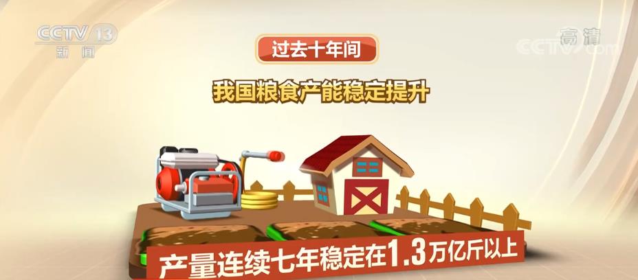 過去十年間,我國糧食產(chǎn)能穩(wěn)定提升,產(chǎn)量連續(xù)七年穩(wěn)定在1.3萬億斤以上,十年再上一個千億斤新臺階。人均糧食產(chǎn)量達到483.5公斤,高于國際公認的400公斤糧食安全線,做到了谷物基本自給、口糧絕對安全。