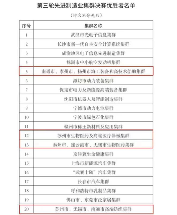 自2019年啟動先進制造業(yè)集群培育工作以來,工信部圍繞新一代信息技術(shù)、高端裝備、新材料、生物醫(yī)藥等重點領(lǐng)域,搭建集群間相互比拼的“賽場”。此次江蘇入選的先進制造業(yè)集群分別是:南通市、泰州市、揚州市海工裝備和高技術(shù)船舶集群,蘇州市生物醫(yī)藥及高端醫(yī)療器械集群,泰州市、連云港市、無錫市生物醫(yī)藥集群,蘇州市、無錫市、南通市高端紡織集群。