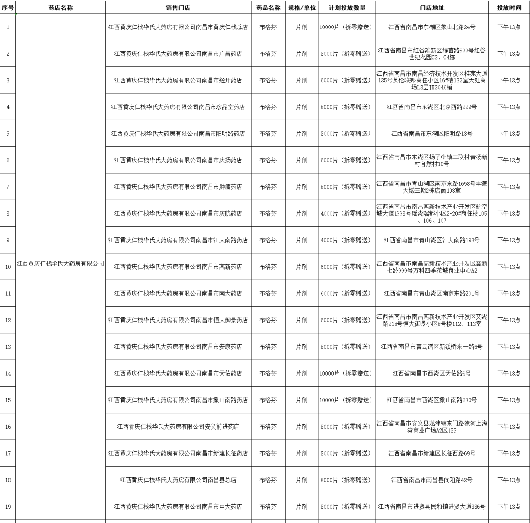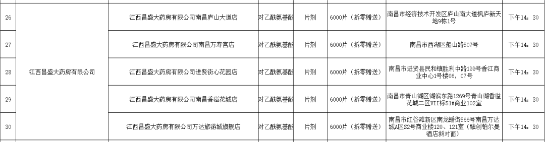 21日,南昌市市場監(jiān)督管理局公布退熱藥品投放名單(第二批),本批次名單共公布7家藥品零售企業(yè)共56家藥店的退熱藥品投放信息,分別是:江西黃慶仁棧華氏大藥房有限公司、江西大參林連鎖藥店有限公司、江西南華大藥房有限公司、江西匯仁堂藥品連鎖股份有限公司、江西昌盛大藥房有限公司、江西益豐大藥房連鎖有限公司、江西康每樂大藥房連鎖有限公司。