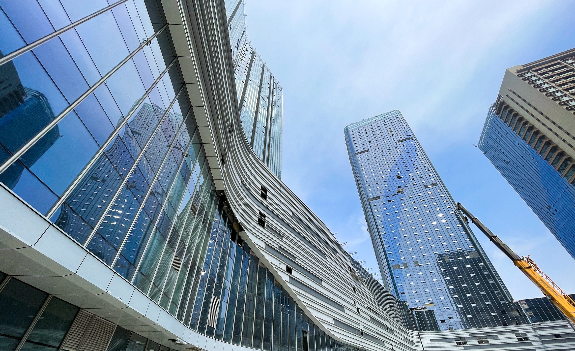 在山西建投·祥澐國際項目建設現(xiàn)場,綠色圍擋里,大型機械正在奮力作業(yè),施工人員忙著主樓外幕墻施工,呈現(xiàn)出一派熱火朝天的場景。
