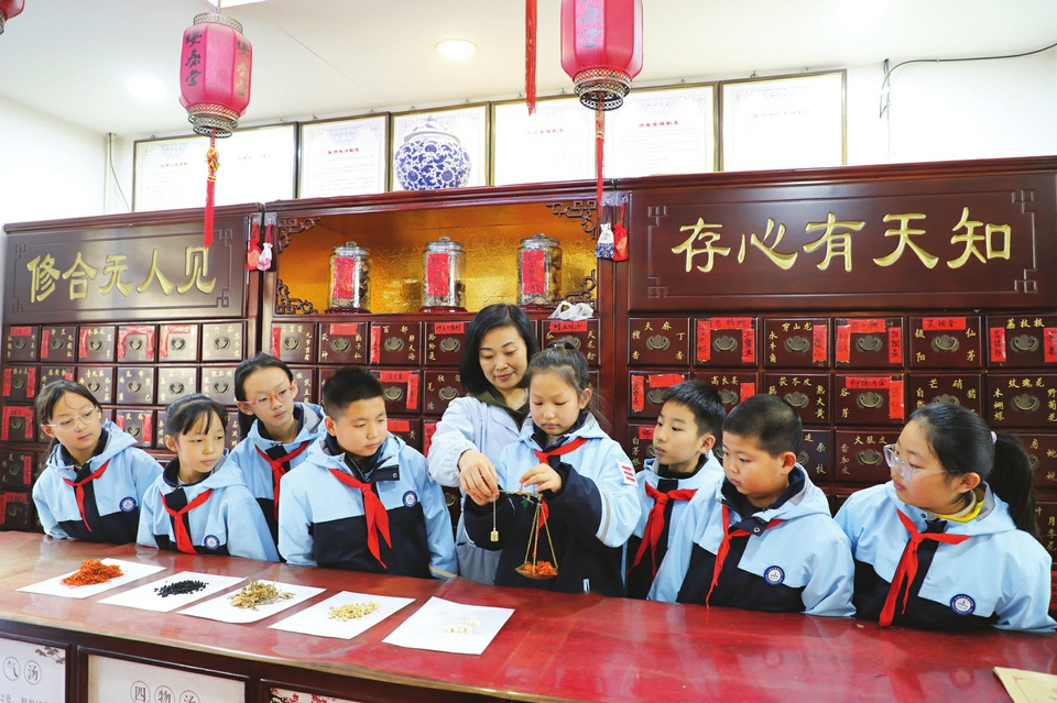 12月7日,陽泉市城區(qū)小陽泉北社區(qū)黨委聯(lián)合陽泉市實驗小學(xué),開展了“學(xué)習(xí)草藥知識、感受中醫(yī)魅力”課外實踐活動。孩子們來到藥店,通過識別中草藥、稱量、加工中草藥材等具體活動,近距離體驗中醫(yī)藥傳統(tǒng)文化特色,感受中醫(yī)藥魅力。圖為孩子們在藥劑師的指導(dǎo)下稱量中草藥。(張春林?jǐn)z)