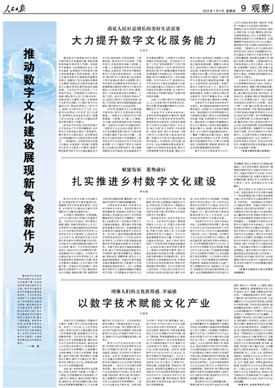 建設(shè)數(shù)字中國是數(shù)字時(shí)代推進(jìn)中國式現(xiàn)代化的重要引擎,是構(gòu)筑國家競(jìng)爭新優(yōu)勢(shì)的有力支撐。數(shù)字文化建設(shè)是數(shù)字中國建設(shè)的重要組成部分。習(xí)近平總書記在黨的二十大報(bào)告中指出:“實(shí)施國家文化數(shù)字化戰(zhàn)略,健全現(xiàn)代公共文化服務(wù)體系,創(chuàng)新實(shí)施文化惠民工程。”這為我們推進(jìn)數(shù)字文化建設(shè)指明了前進(jìn)方向、提供了根本遵循。新時(shí)代新征程,如何提升數(shù)字文化服務(wù)能力?如何推動(dòng)數(shù)字文化產(chǎn)業(yè)高質(zhì)量發(fā)展?如何扎實(shí)推進(jìn)鄉(xiāng)村數(shù)字文化建設(shè)?本期觀察版圍繞這些問題進(jìn)行探討。