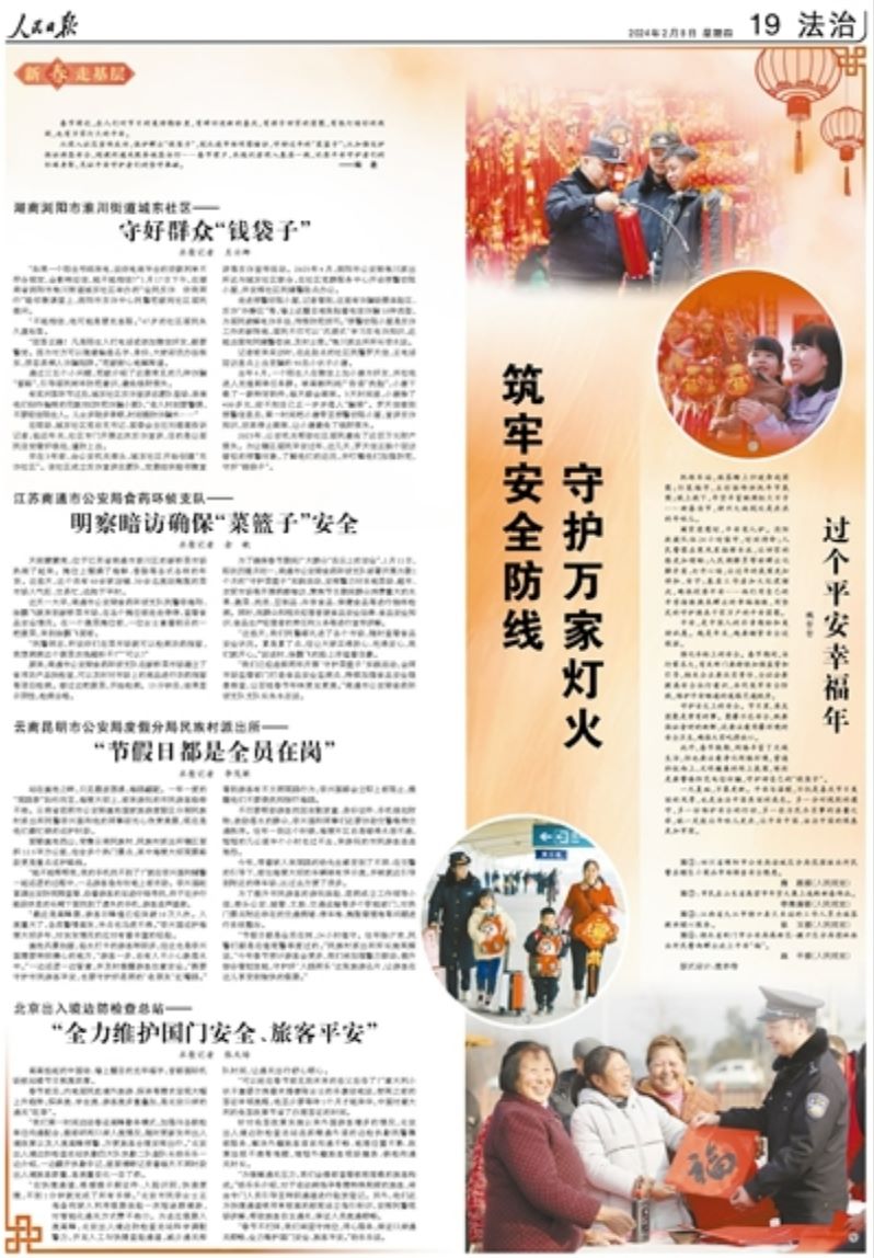 從深入社區(qū)宣傳反詐,保護(hù)群眾“錢袋子”,到扎進(jìn)市場(chǎng)明察暗訪,守好過年的“菜籃子”;從加強(qiáng)巡護(hù)保證游客安全,到便利通關(guān)服務(wù)旅客出行……春節(jié)前夕,本報(bào)記者深入基層一線,記錄平安守護(hù)者們的忙碌身影,見證平安守護(hù)者們的堅(jiān)守奉獻(xiàn)。