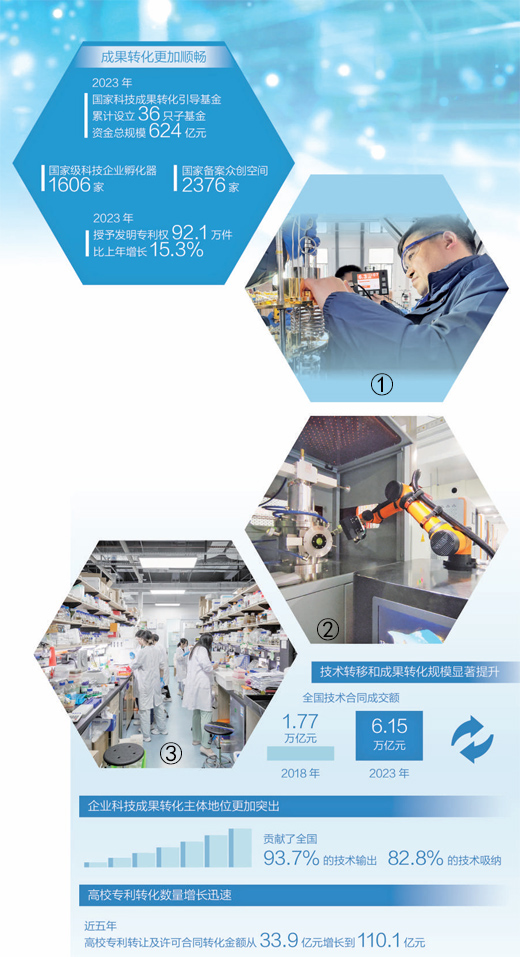 印發(fā)《“十四五”技術(shù)要素市場(chǎng)專項(xiàng)規(guī)劃》,從健全科技成果產(chǎn)權(quán)制度、強(qiáng)化高質(zhì)量科技成果供給等方面推動(dòng)成果轉(zhuǎn)化;印發(fā)《專利轉(zhuǎn)化運(yùn)用專項(xiàng)行動(dòng)方案(2023—2025年)》,對(duì)專利轉(zhuǎn)化運(yùn)用進(jìn)行專門部署;制定《高校和科研機(jī)構(gòu)存量專利盤活工作方案》,發(fā)揮市場(chǎng)和政府的協(xié)同作用,共同推動(dòng)專利成果更好更快地轉(zhuǎn)化為現(xiàn)實(shí)生產(chǎn)力……近年來,一系列部署,一項(xiàng)項(xiàng)探索,讓創(chuàng)新鏈的好技術(shù)變成產(chǎn)業(yè)鏈的新應(yīng)用,科技創(chuàng)新正在成為培育發(fā)展新質(zhì)生產(chǎn)力的新動(dòng)能。