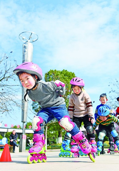 頭戴鮮艷頭盔,腳踩輪滑鞋,幾個四五歲的“小豆丁”正在教練指導(dǎo)下練習(xí)輪滑。起步、擺臂、穿越障礙,不小心滑倒了,也會一骨碌爬起來繼續(xù)向前。