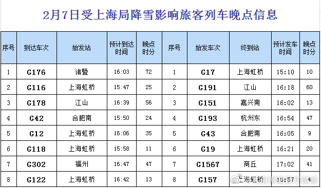 據(jù)@北京南站官方微博消息,受上海局降雪影響,北京南站京滬高鐵部分到達(dá)、始發(fā)列車有不同程度晚點(diǎn)。截至目前,具體晚點(diǎn)情況信息如下,請廣大旅客及時關(guān)注12306官方信息和車站公告。