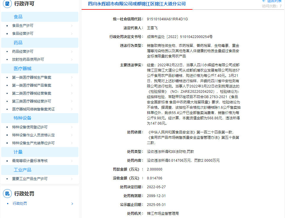 處罰決定文書顯示,經(jīng)查,2022年2月22日,當(dāng)事人四川永輝超市有限公司成都錦江區(qū)錦江大道分公司從成都凱博農(nóng)業(yè)發(fā)展有限公司購進(jìn)57公斤食用農(nóng)產(chǎn)品砂糖桔,購進(jìn)價(jià)格為每公斤7.40元。當(dāng)事人銷售的砂糖桔經(jīng)抽樣檢驗(yàn),苯醚甲環(huán)唑項(xiàng)目不符合GB 2763-2021《食品安全國家標(biāo)準(zhǔn) 食品中農(nóng)藥最大殘留限量》要求,檢驗(yàn)結(jié)論為不合格。據(jù)調(diào)查,該抽檢不合格批次砂糖桔除1.6公斤售賣抽樣單位外,剩余55.4公斤已全部售賣消費(fèi)者,銷售價(jià)格為每公斤9.98元。經(jīng)計(jì)算,本案貨值金額為568.86元,違法所得為147.06元。
